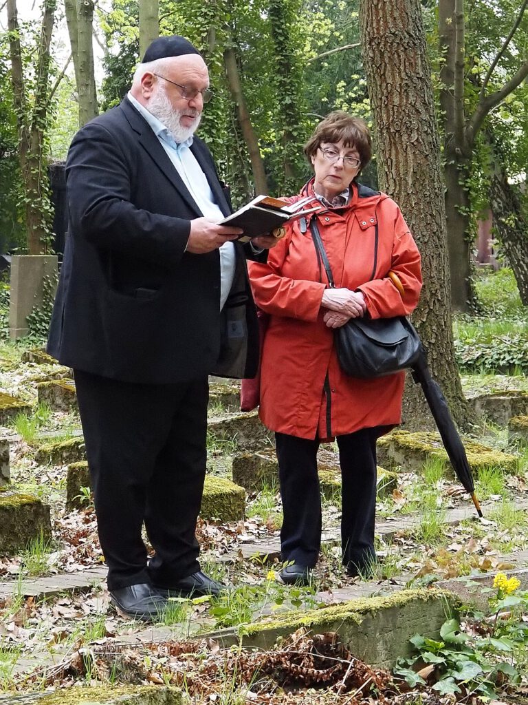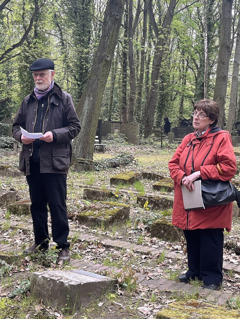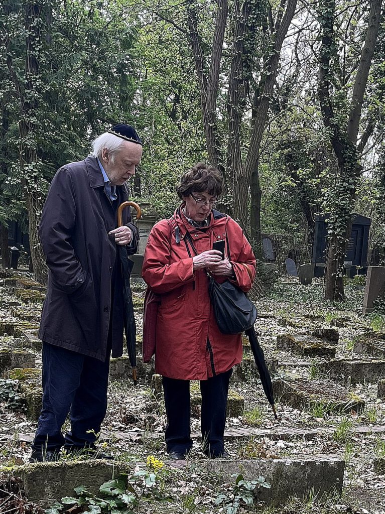 Lydia Tichauer und ihr Partner David bei der Betrachtung von Salo Druckers Grabstein. 19.04.2026. dz