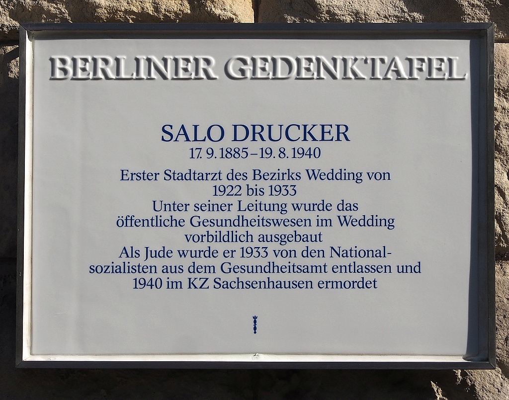 Am Gesundheitsamt Wedding war die Gedenktafel für Salo Drucker Jahrzehnte lang ein vertrautes Bild. Als plötzlich der Abriss des Gebäudes bevorstand, galt es zumindest, die Tafel in Obhut zu nehmen. Lange stand sie dann bei der Historischen Gesellschaft zu Berlin zur Aufbewahrung, bis es in der Reinickendorfer Straße Neubaupläne für das Grundstück gab. Ein Anlass, genauer zu Salo Druckers beruflichem Leben zu recherchieren. Er hatte 1922 vom Jüdischen Krankenhaus aus begonnen, das Gesundheitsamt im Wedding aufzubauen. Damit stand der neue Ort für die Gedenktafel fest, und wir konnten in der Iranischen Straße im September 2024 die Zweitenthüllung der Tafel erleben.