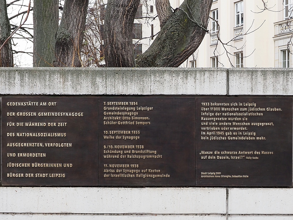 Sucht man nach dem Ort der ehemaligen großen Synagoge Leipzigs, findet man ihn unweit der Thomaskirche in der Gottschedstraße. Dort bilden seit 2014 140 leere Stühle aus Bronze das Mahnmal für die zerstörte Versammlungsstätte der ursprünglich über 13 000 Leipziger Juden.