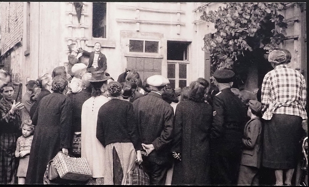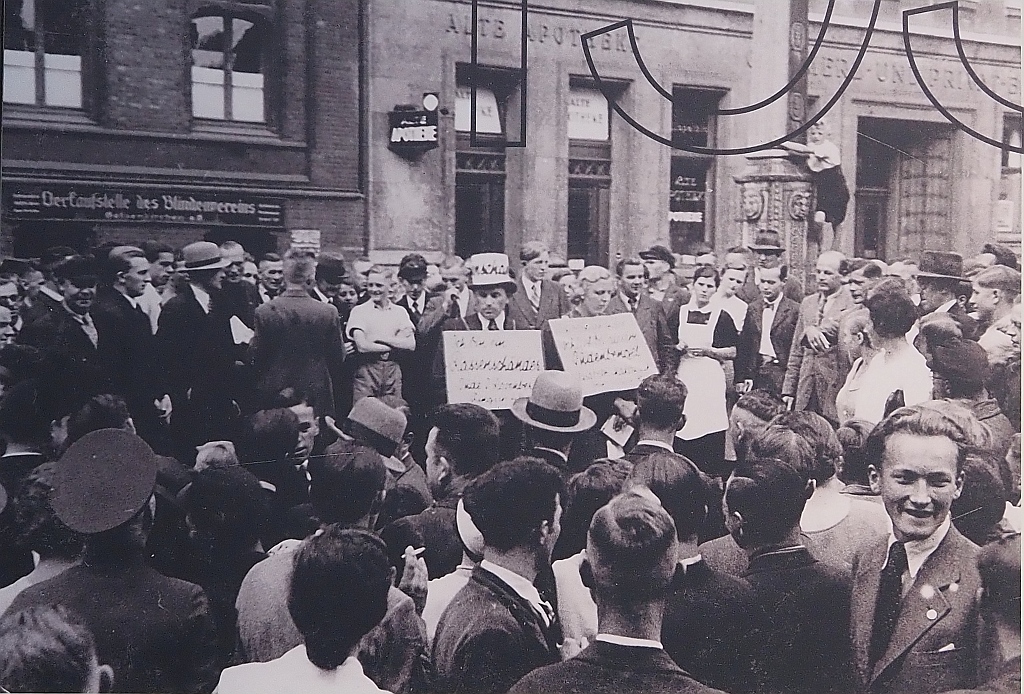 Bürger bei einer Versteigerung jüdischen Eigentums in der Gegend von Hanau 1942.Franz Weber, Medienzentrum Hanau. Gesehen in der Ausstellung „Der Holocaust – Was wussten die Deutschen? Topographie des Terrors 2026.