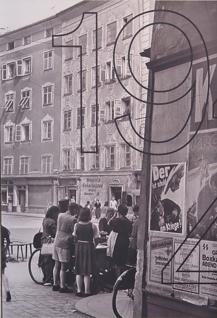 Straßenszene mit antisemitischen Plakat „Der ist schuld am Krieg!“, Salzburg 1944. Hans Hubmann, bpk-Fotoarchiv, 30025313. Gesehen in der Ausstellung „Der Holocaust – Was wussten die Deutschen? Topographie des Terrors 2026.