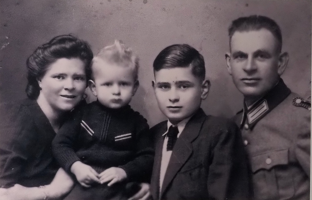 Siegfried Hille (14 Jahre) mit seinen Eltern, Martha und Gustav Hille, und seinem Bruder (1940 – 1945). (Sein Vater, als Ordnungspolizist in Mizocz eingesetzt, zeigte ihm seine Fotos von Erschießungen dort. Die Fotos gelangten schließlich auch in den Vatikan.) Gesehen in der Ausstellung „Der Holocaust – Was wussten die Deutschen? Topographie des Terrors 2026.