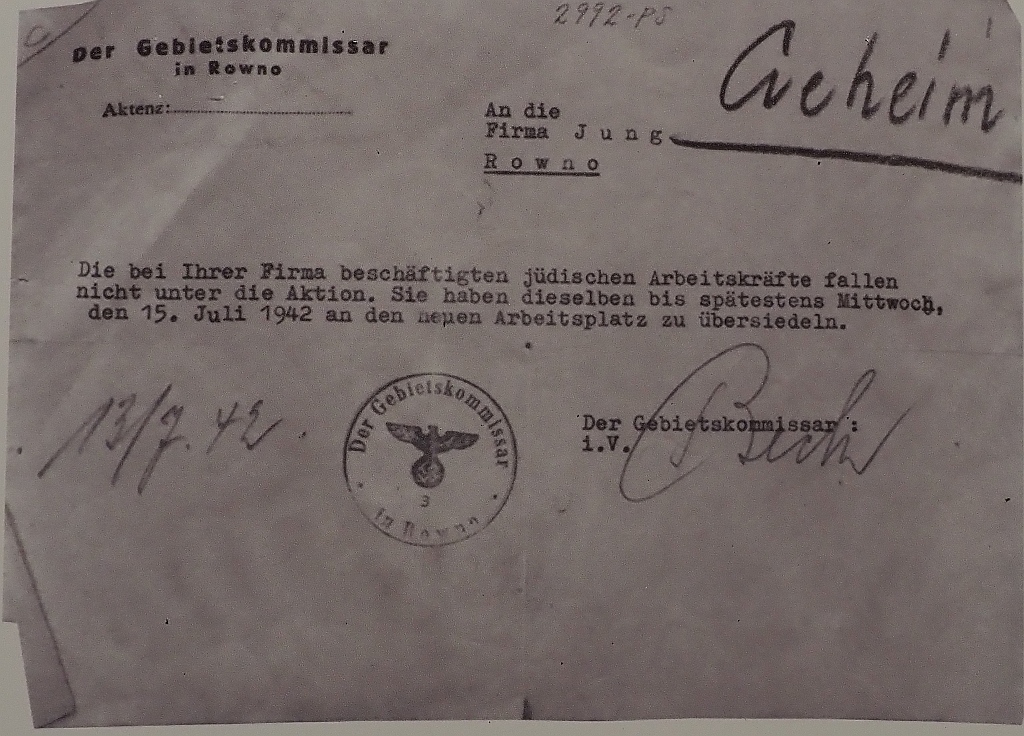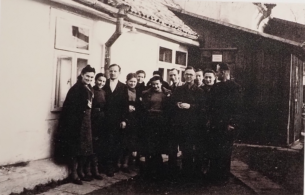 Hermann Gräbe (4. von rechts) mit deutschen und polnischen Bürokräften und Ingenieuren der Firma Jung in Zdolbunów 1942. (Die jüdischen Mitarbeiterinnen sind an weißen Aufnähern zu erkennen. Mit gefälschten Unterlagen bewahrte er Juden vor der Deportation).