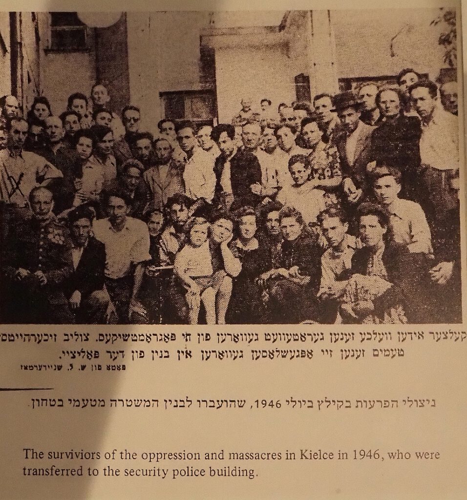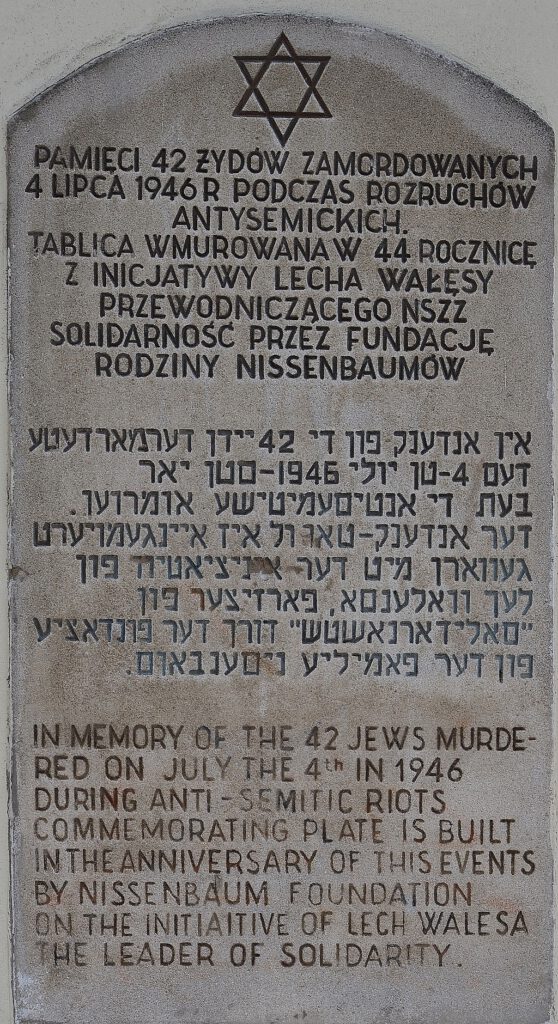Eine Gedenktafel berichtet vom Geschehen am 4. Juli 1946, dem bekannten Pogrom in Kielce. In einer Ausstellung sind Fotos vom Geschehen zusammengestellt und wird in einem Protokoll vom Ablauf berichtet. Filme halten die Aussagen von Überlebenden fest. Diese Bilder begleiten einen noch lange nach dem Besuch.