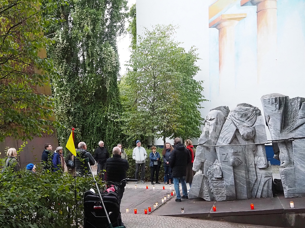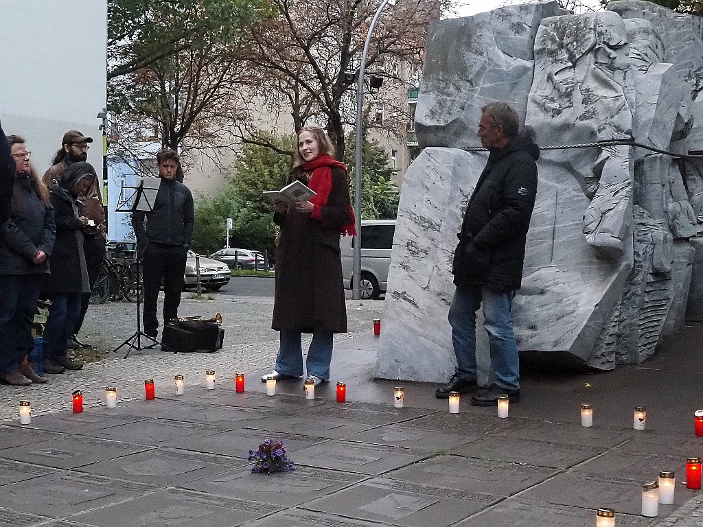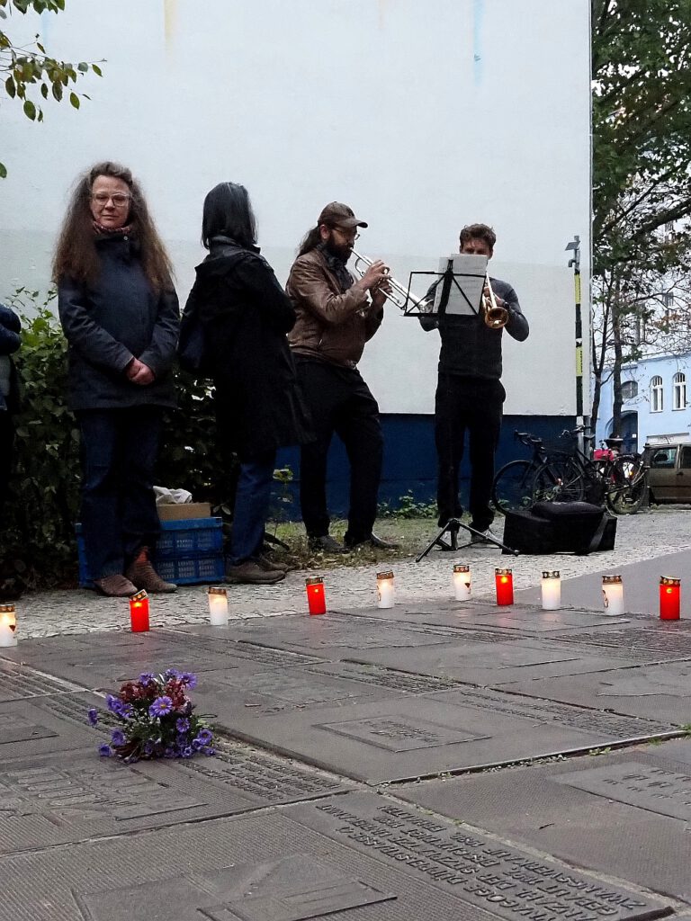 Dann konnten die Gedanken frei wandern, während zwei Vertreter der bezirklichen Musikschule ein anrührendes Musikstück auf der Trompete vortrugen. Es verfehlte seine Wirkung nicht, etliche Passanten blieben stehen, hörten bis zum Ende zu und interessierten sich dann für unser Treffen.