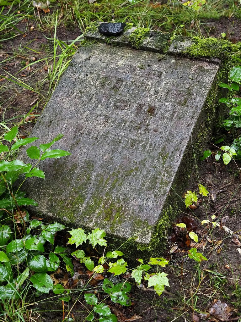 Bei einem weiteren Besuch im September diesen Jahres ließen sich nach einer sorgfältigen Reinigung des Grabsteins und bei genauer Betrachtung Reste einer Beschriftung erkennen. Aber nur der Eingeweihte vermochte auch Teile der Schrift entziffern.