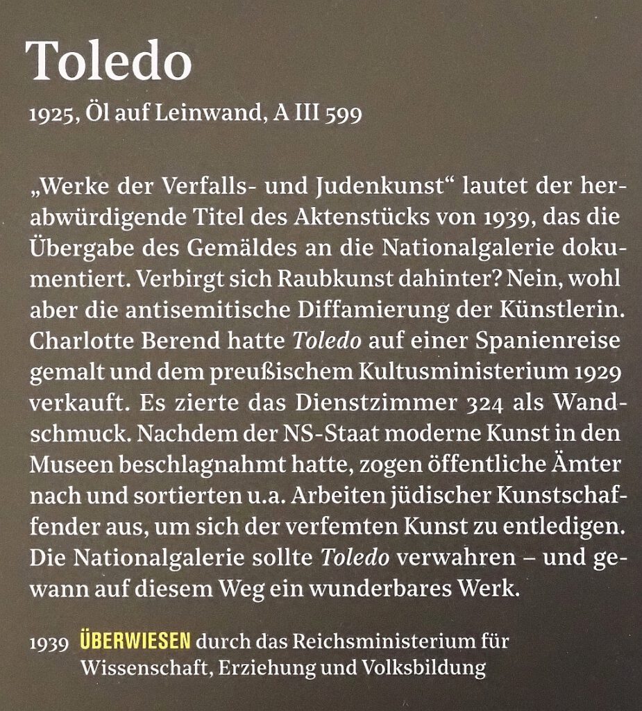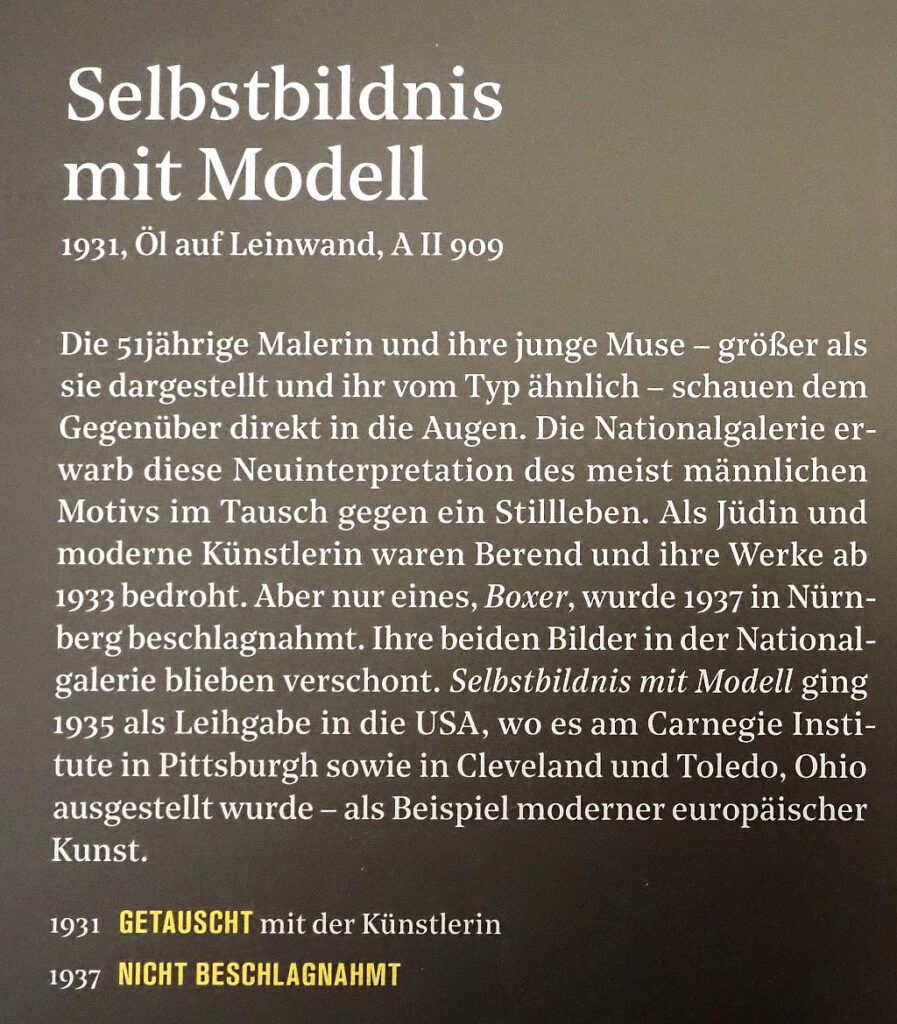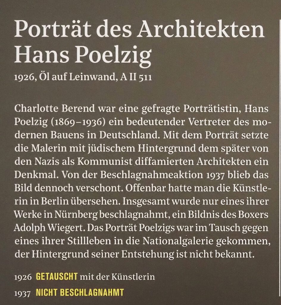 Charlotte Berend-Corinths Werk sah sich trotz ihrer jüdischen Herkunft offenbar nicht im gleichen Maß den Angriffen der NS-Kulturpolitik ausgesetzt. Möglicherweise weil sich ihre Portraits, ihre Theaterbilder und graphischen Mappen vorwiegend in Privatbesitz befanden und so in der Öffentlichkeit weniger präsent waren.