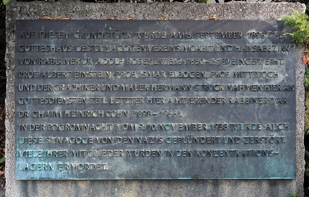 Den Standort der Hofsynagoge des Synagogenvereins Moabit und Hansabezirk in der Lessingstraße markiert heute nur noch ein Gedenkstein, ein Foto ist nicht vorhanden, nur die Bauzeichnung gibt es noch.