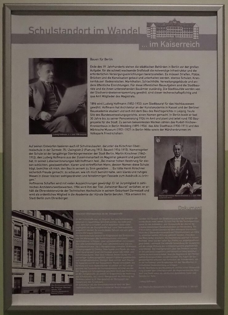In dem großzügig vom Stadtbaurat Ludwig Hoffmann 1914 erweiterten Schulgebäude hat sie schon einige Vorgänger gehabt. Erinnert sei hier vor allem an die Kirschner-Oberrealschule, 1913 gegründet.