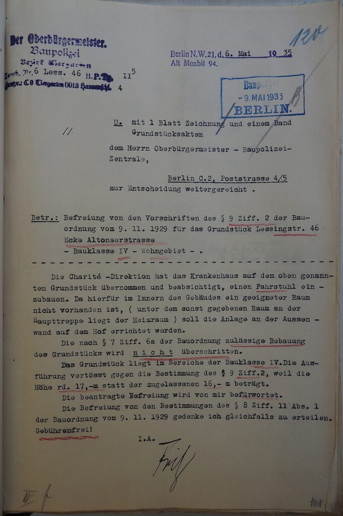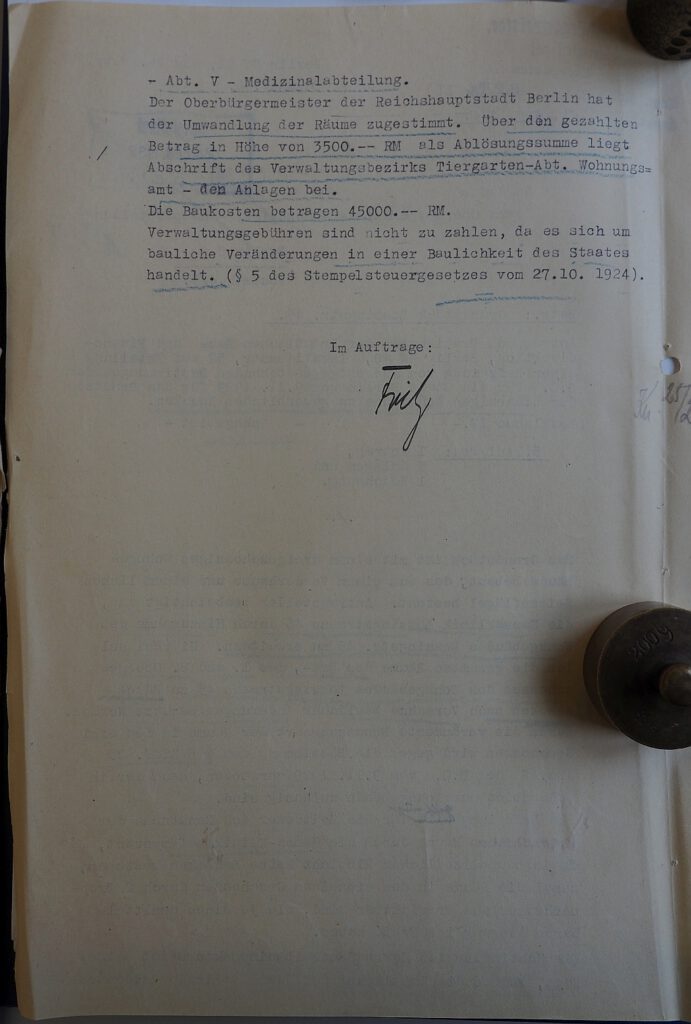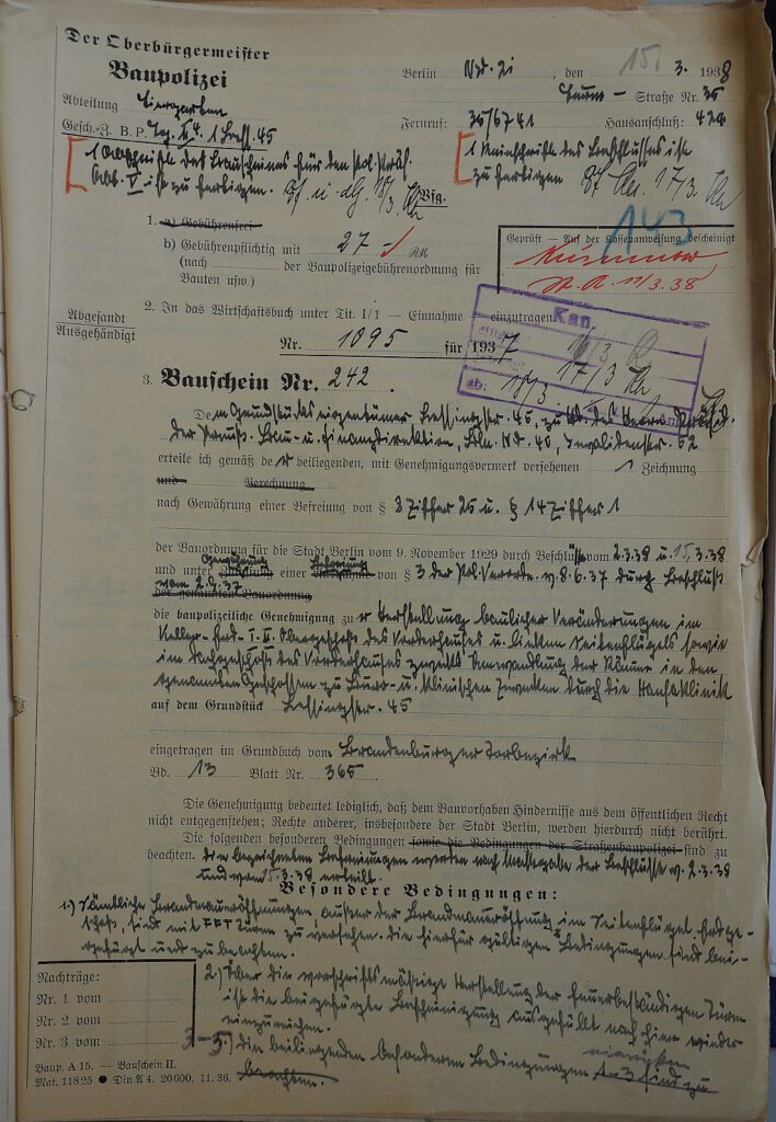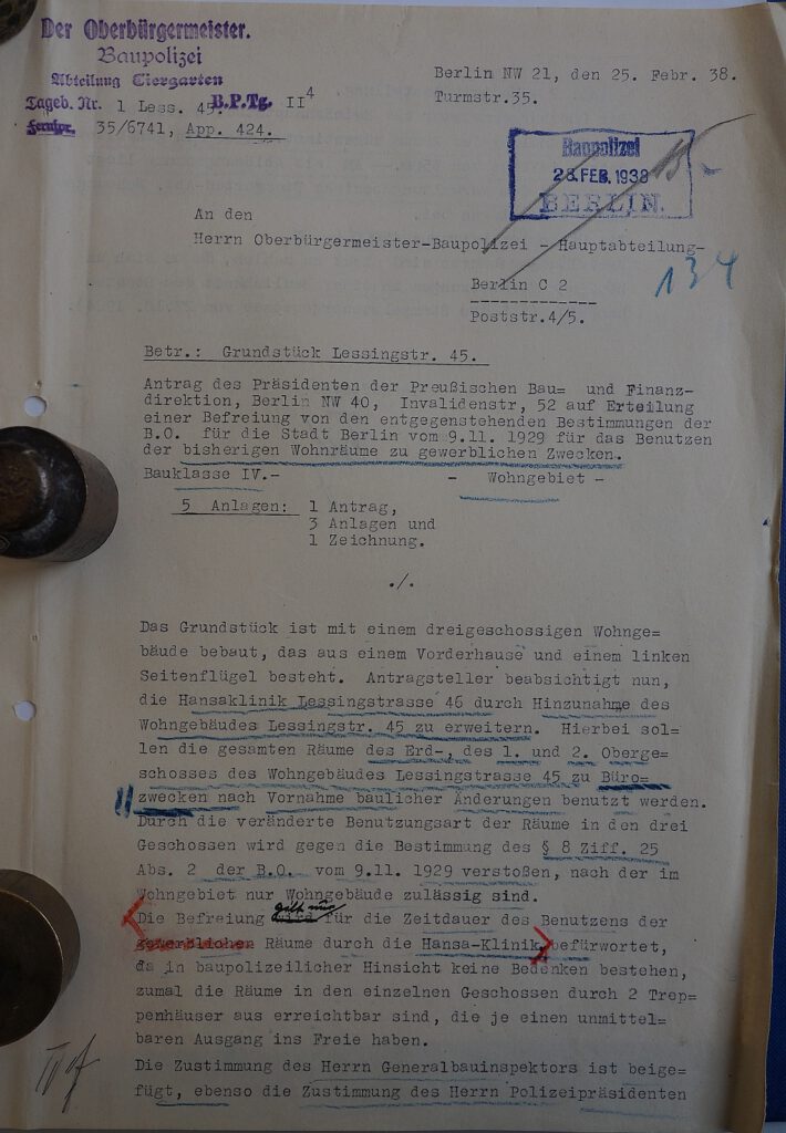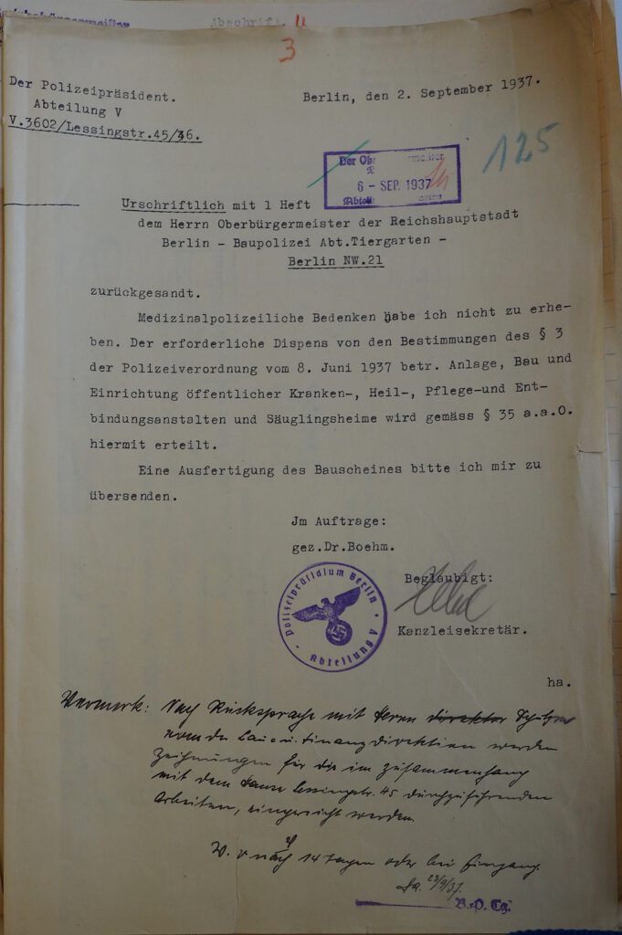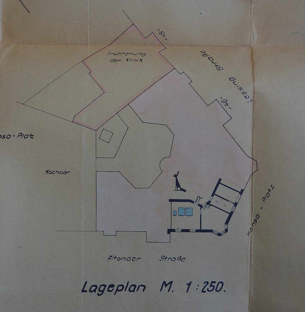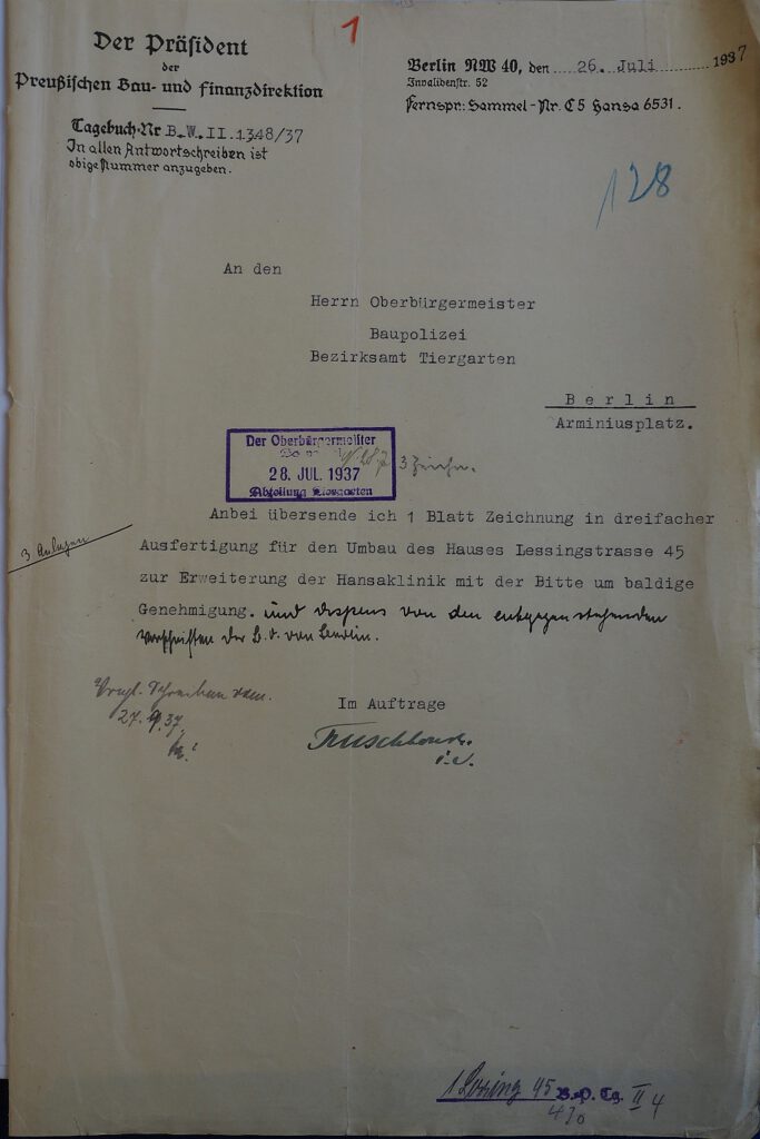 Dokumente aus der Bauakte Lessingstraße Nr. 46 bei der Erweiterung der Klinik am Hansaplatz 1937 zur Neurochirurgischen Universitätsklinik.